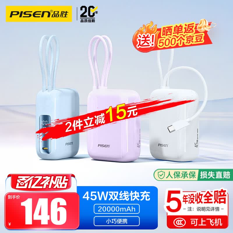 品胜【3C认证上飞机】小魔方充电宝45W快充自带双线20000毫安便携移动电源40W适用苹果17户外储能电源