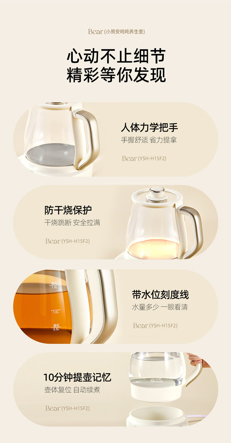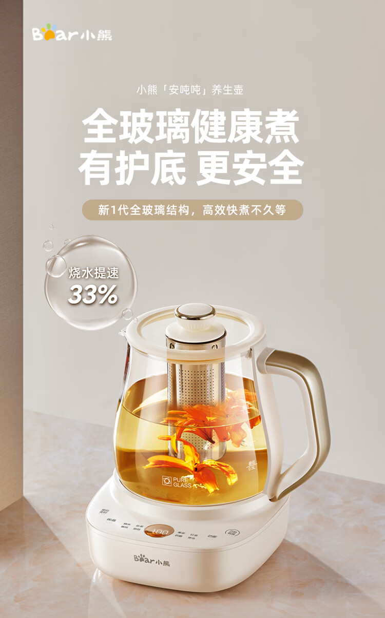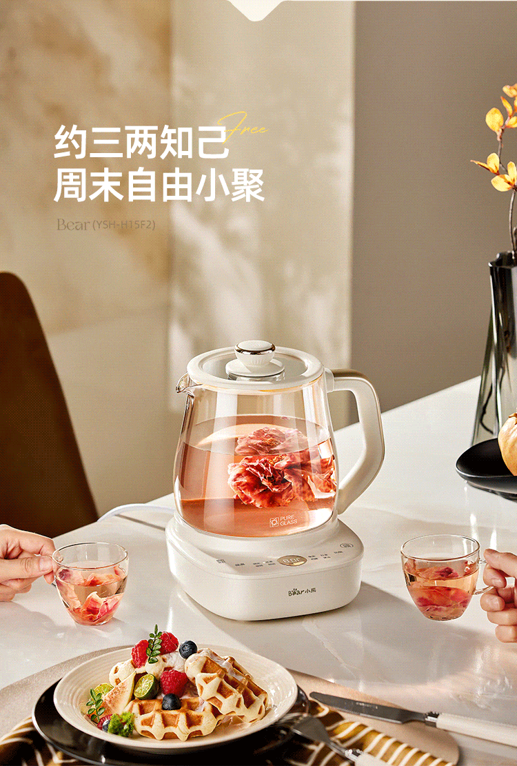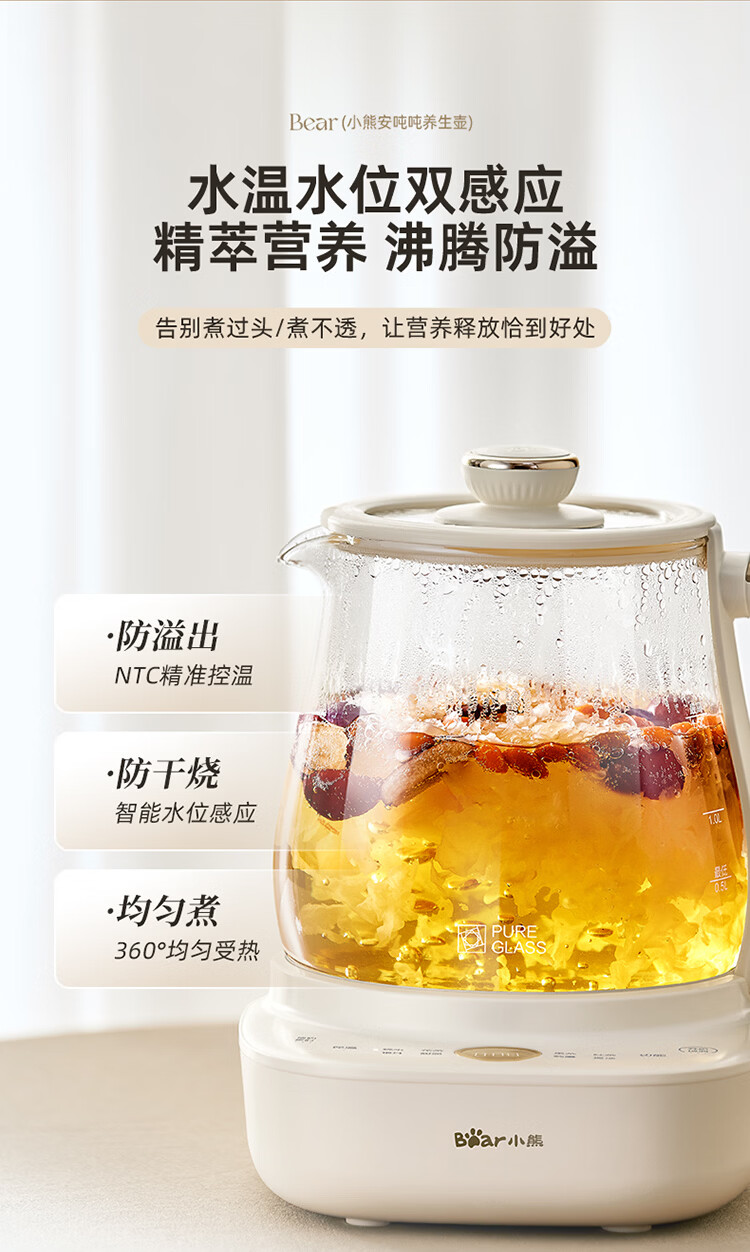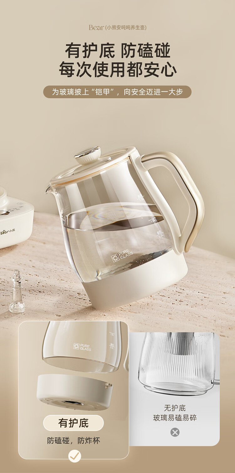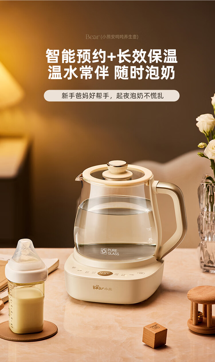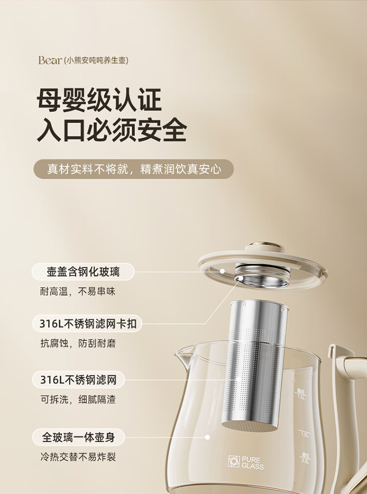 小熊(Bear)全玻璃养生壶 安吨吨恒温壶 办公室多功能煮茶壶 0胶水0金属 72h保温 1.5L YSH-H15F2