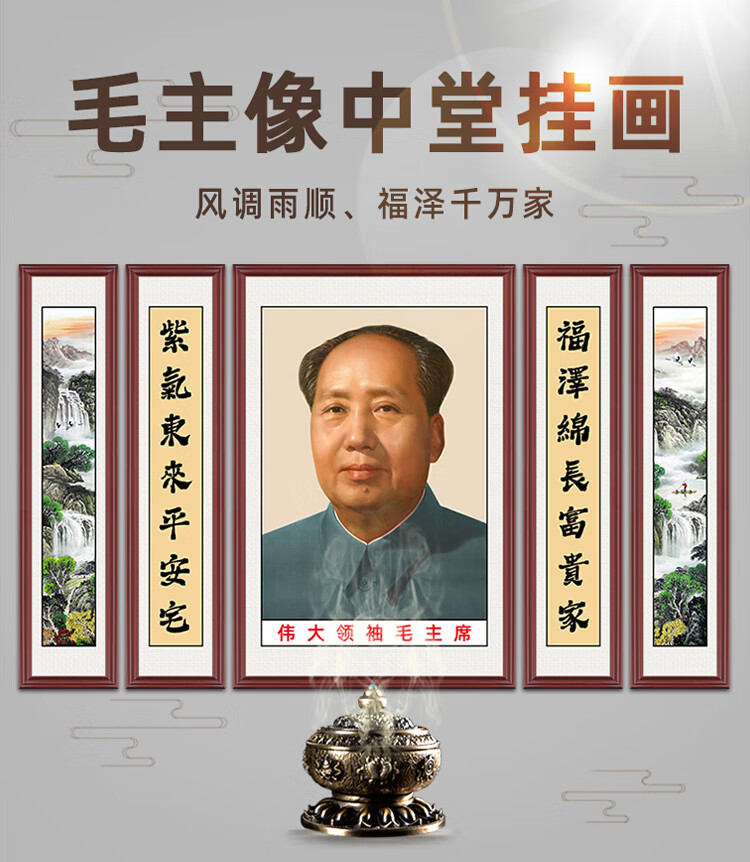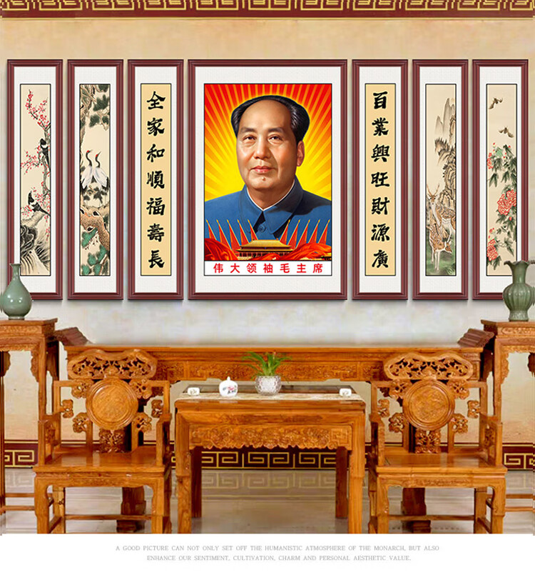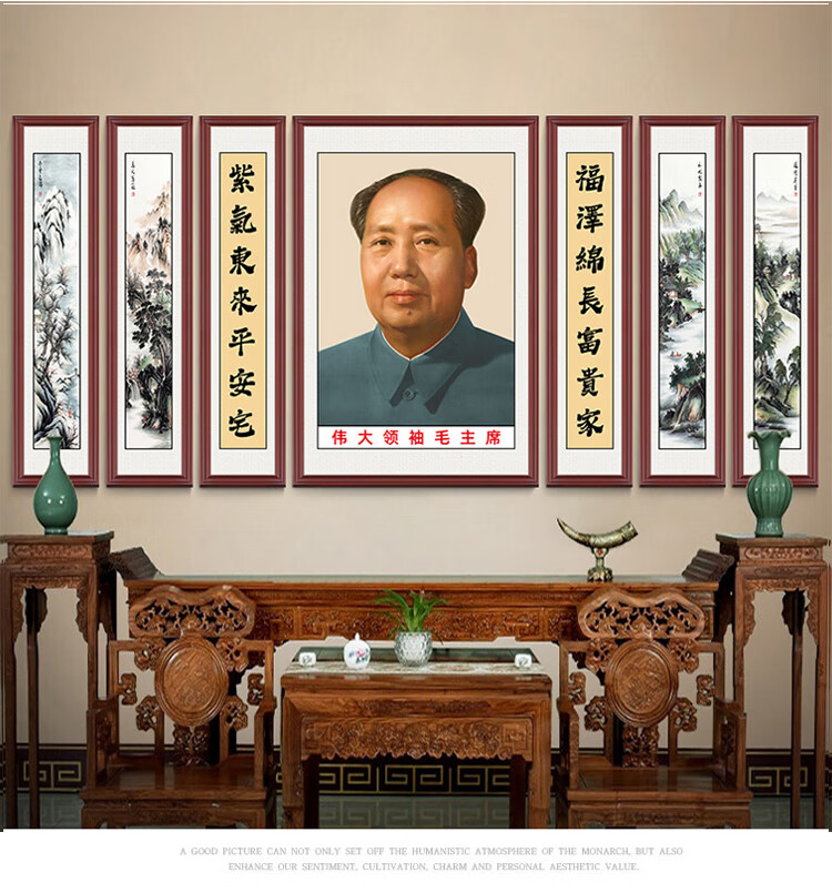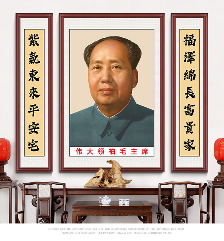 视觉居易毛主席墙画伟人画像有框大厅中堂画客厅农村堂屋大气挂像头像挂画 三联:ZTH050-01-72年侧耳版 左右字画35*150cm中间100*150cm