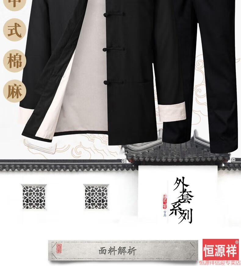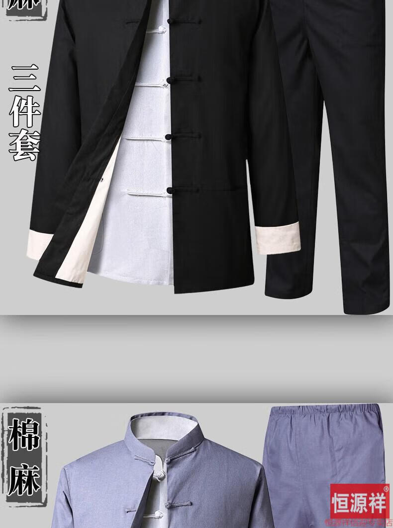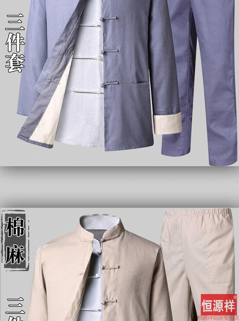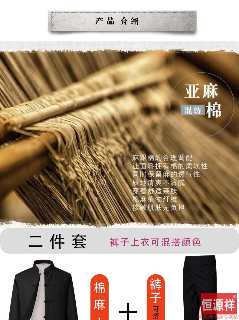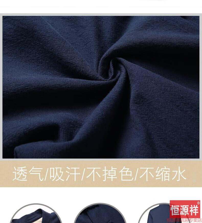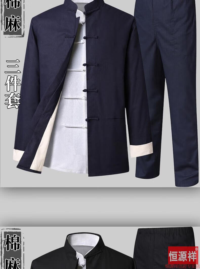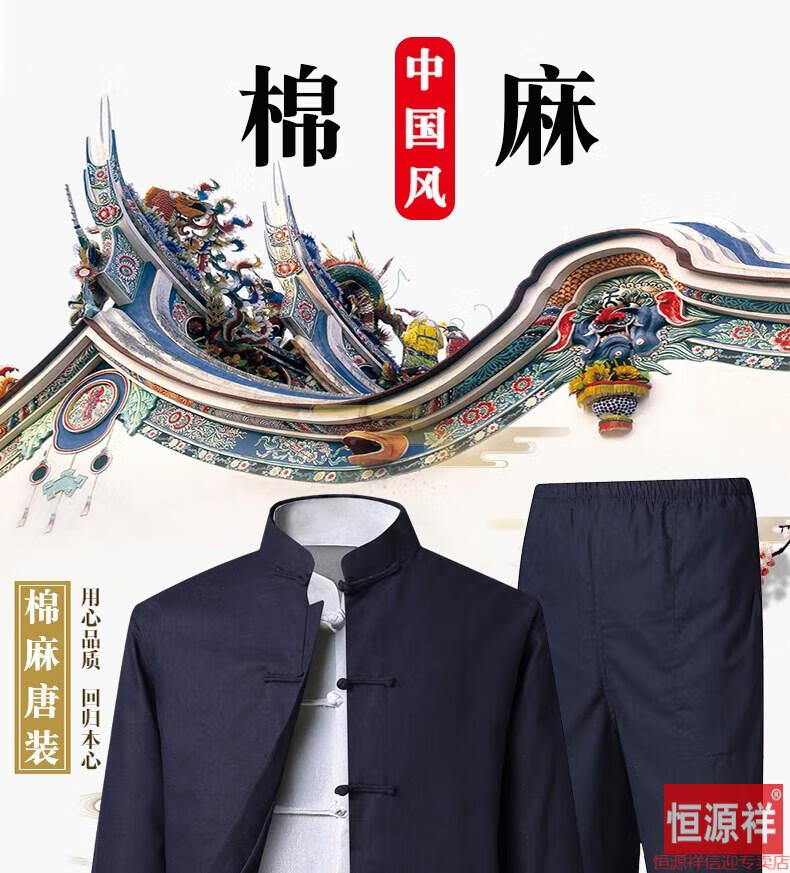 恒源祥品牌高档男装中式男士唐装套装长袖纯色亚麻宽松中山装中国风棉麻春秋款民族风 藏青色【二件套】 175