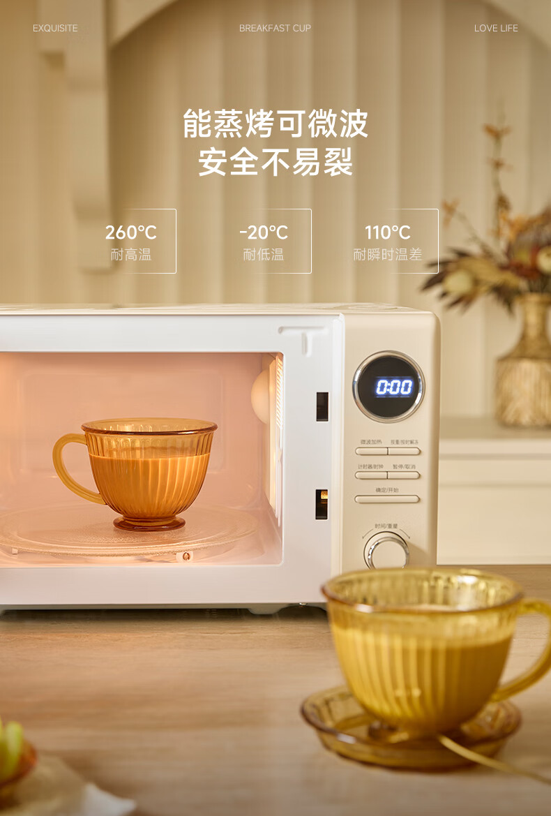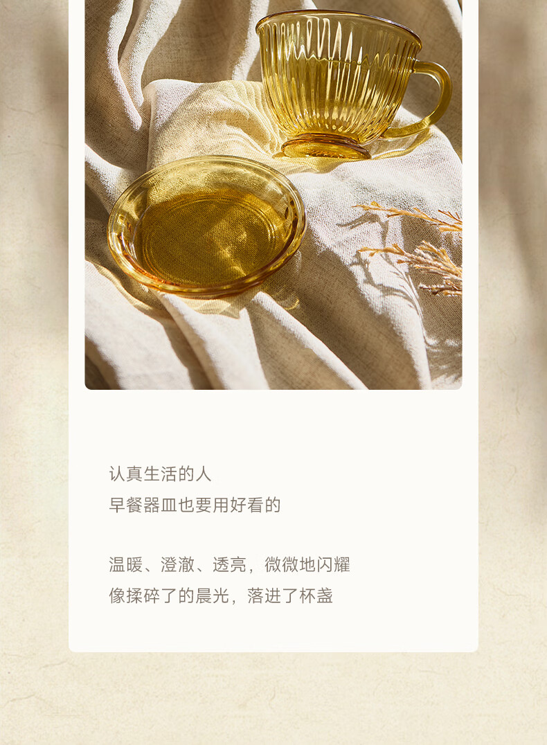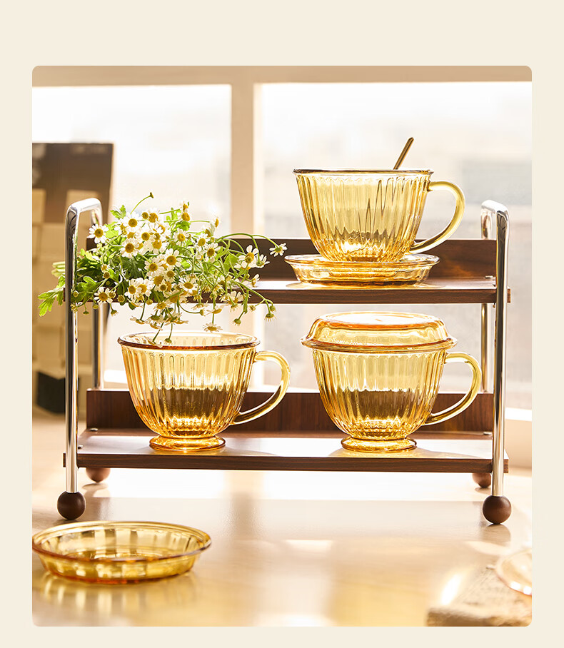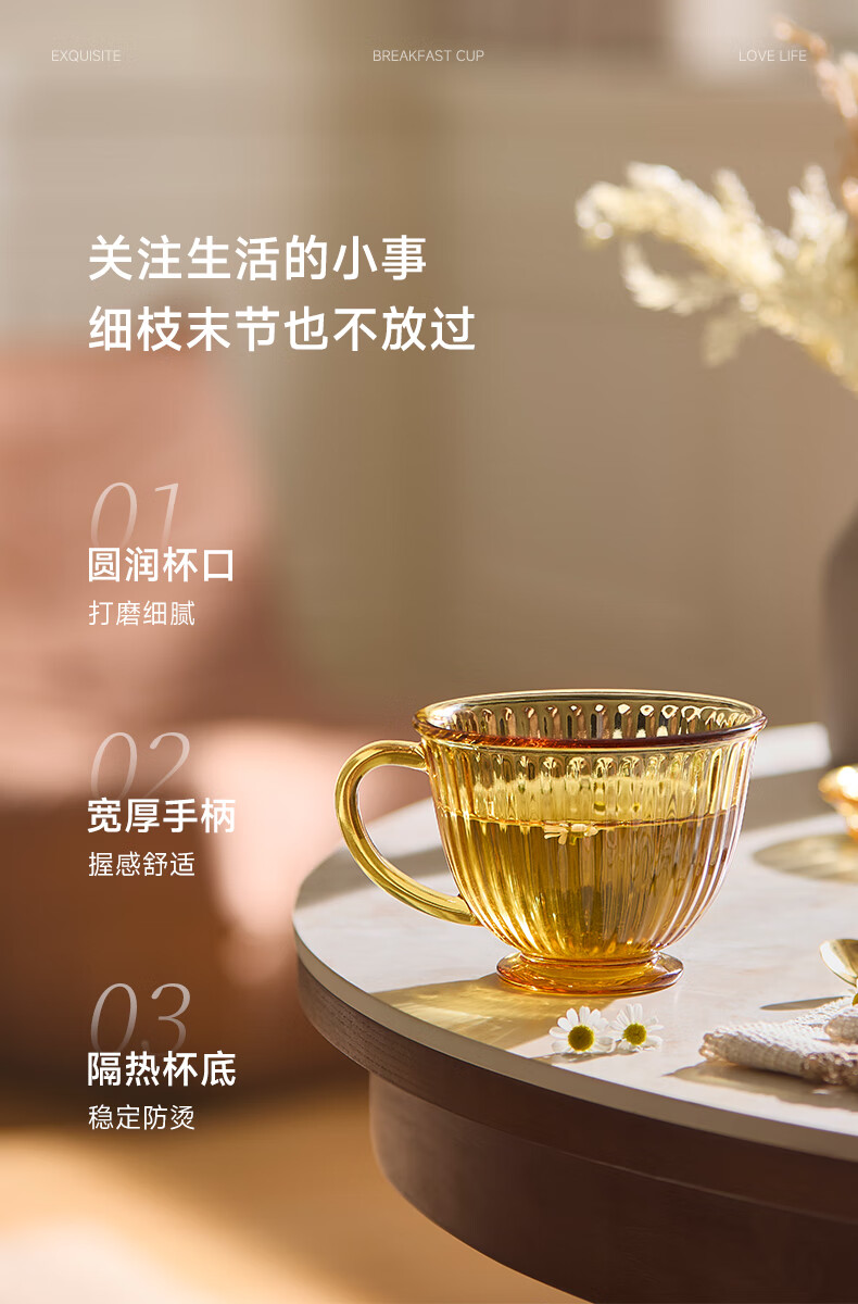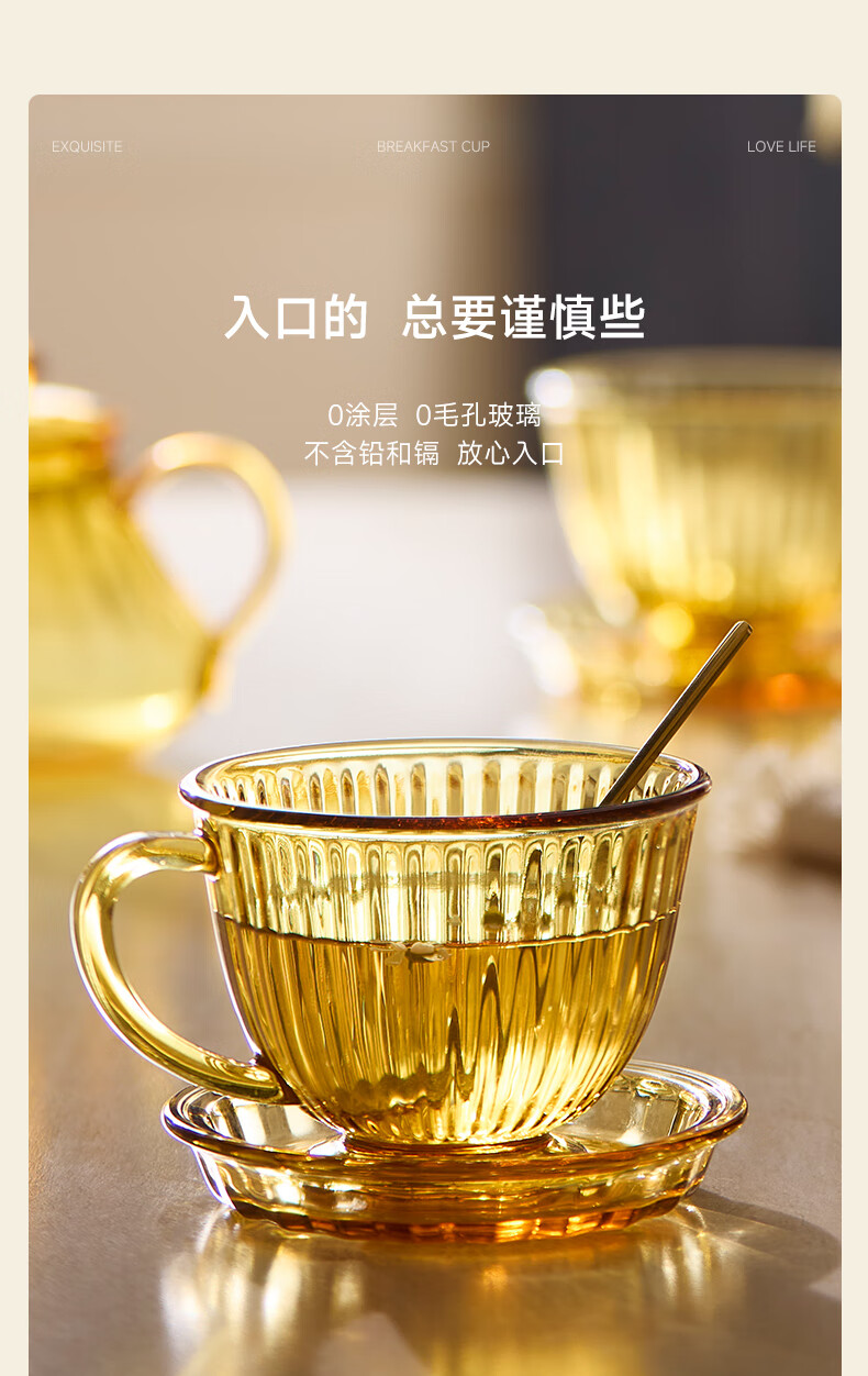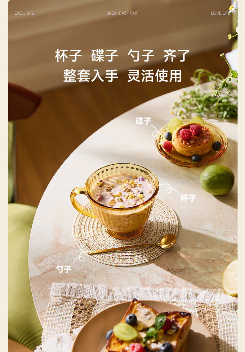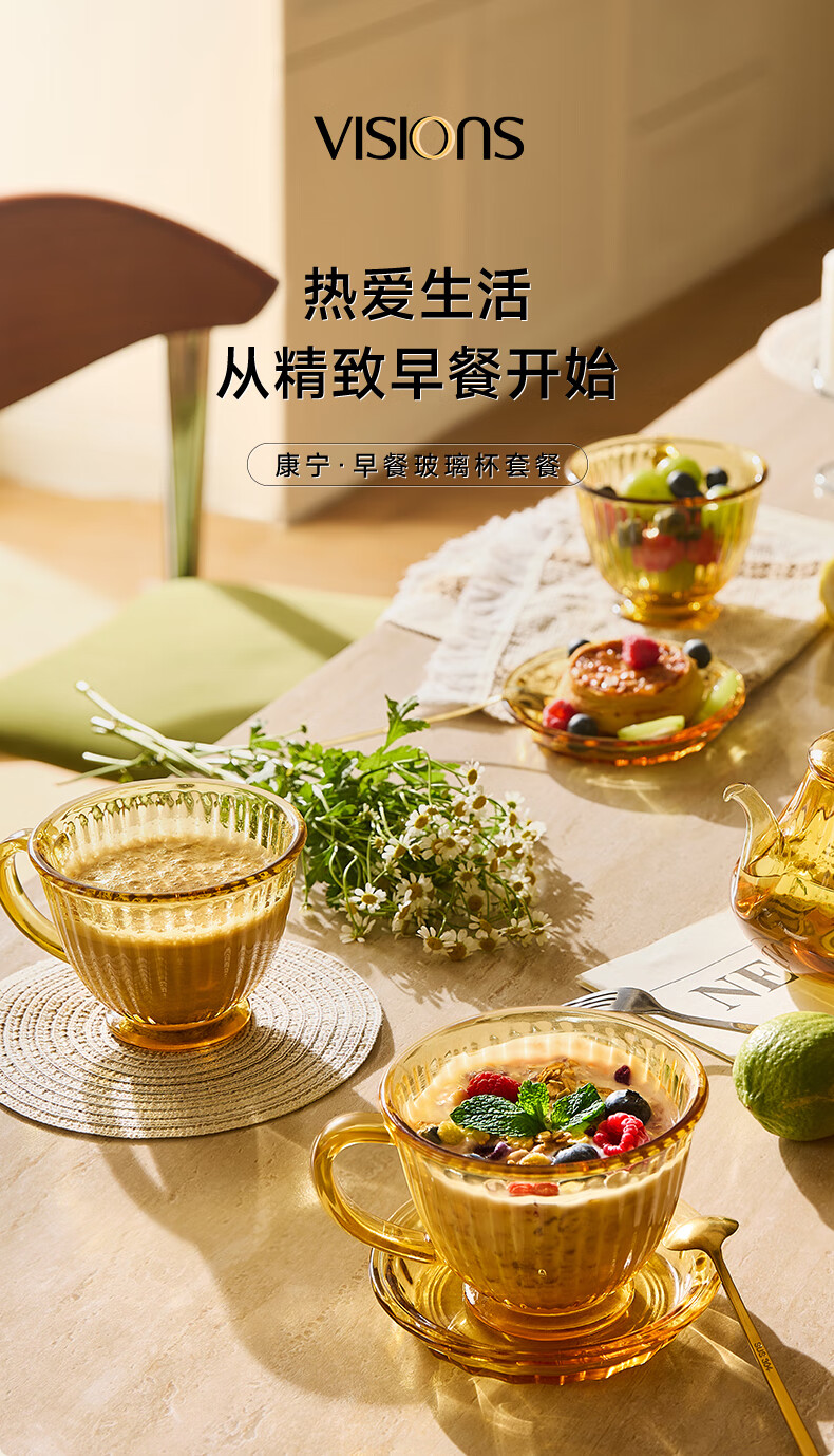 康宁(VISIONS)琥珀色早餐杯玻璃杯燕麦牛奶杯家用带盖勺子咖啡杯2杯2盖2勺